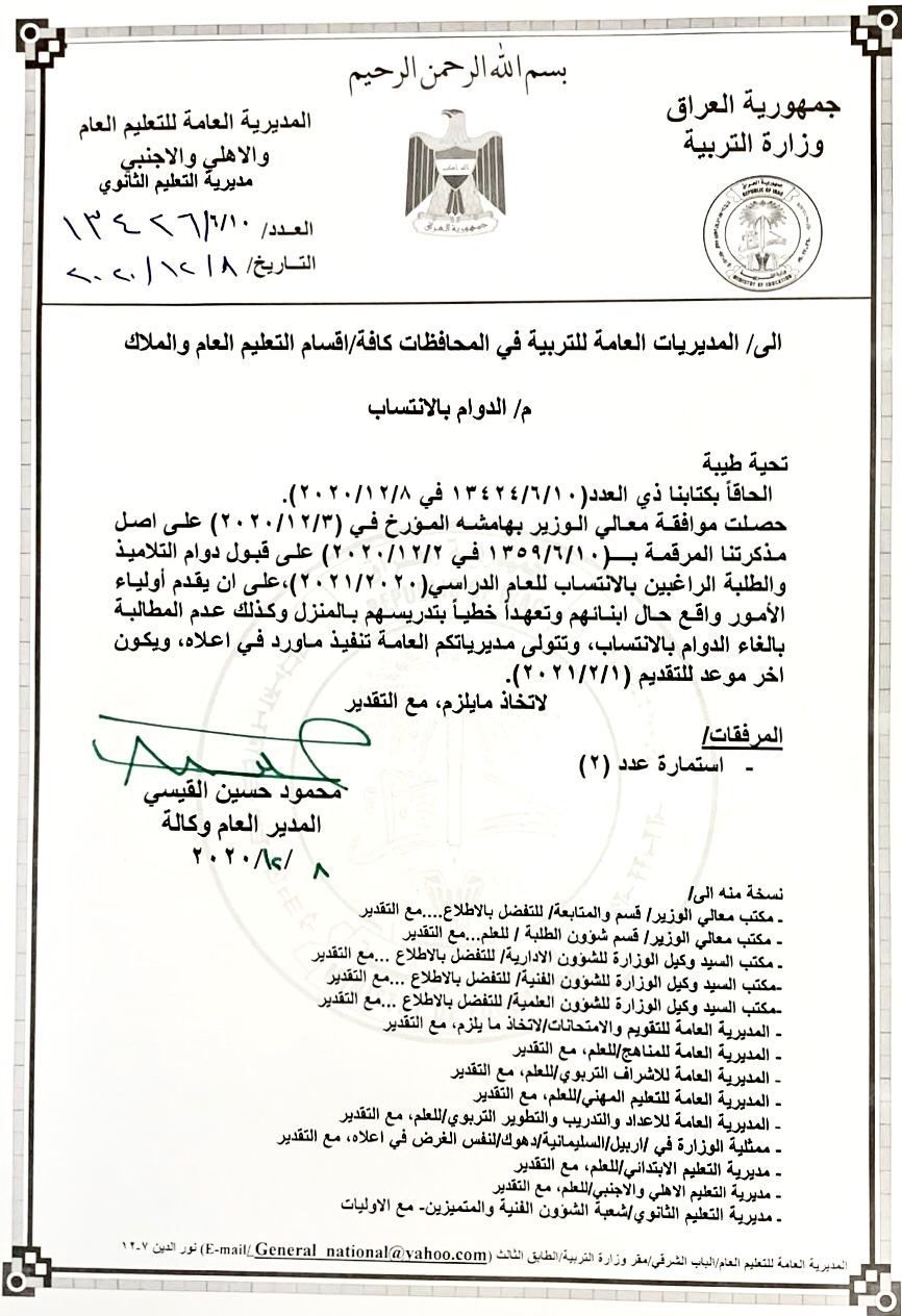 صورة الكتاب الرسمي الخاص بالانتساب 2021 للمدارس العراقية